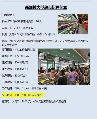 新加坡大型超市招聘海鲜包装兼排货员(45岁以下男女不限)