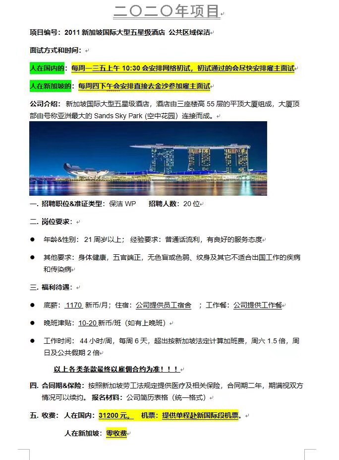 新加坡金沙集团公共区域保洁&客房服务员招聘(包吃住)——视频面试