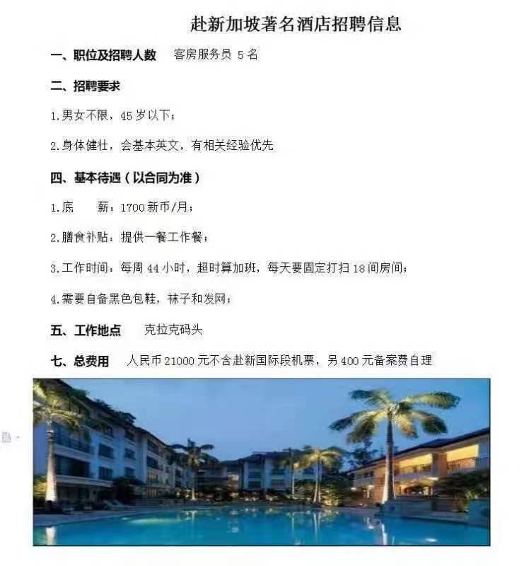 新加坡星级酒店客房服务员招聘(45岁以下)——视频面试