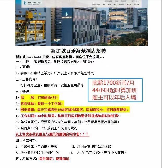新加坡最高底薪(1700新币)的客房服务员招聘