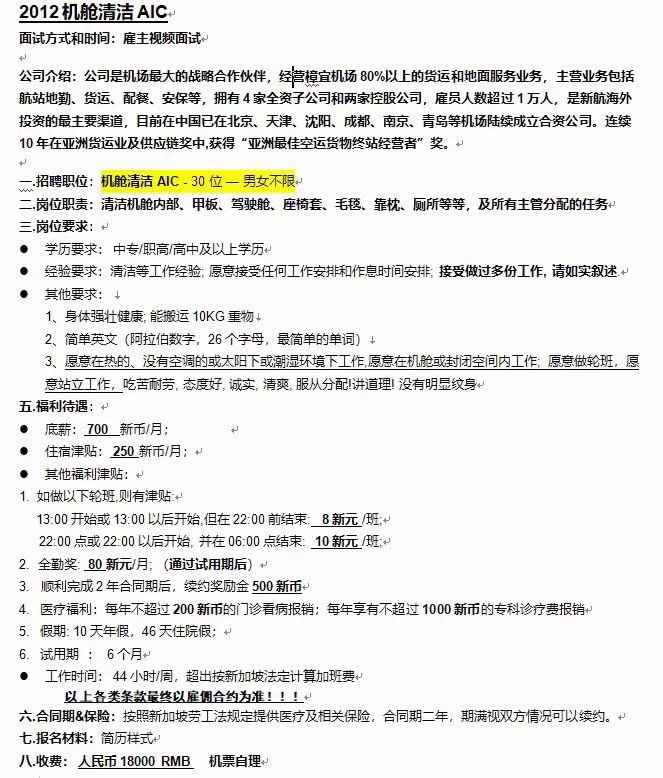 新加坡樟宜机场机舱清洁工(男女不限45岁以下)