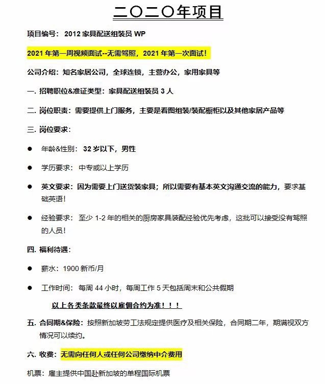 新加坡家具组装工招聘(零收费,高工资)