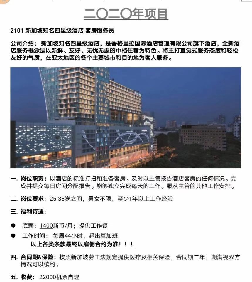 新加坡香格里拉旗下酒店客房服务员招聘