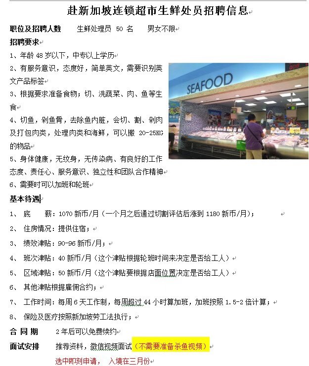 新加坡大型连锁超市招聘生鲜处理员(48岁以下男女不限)