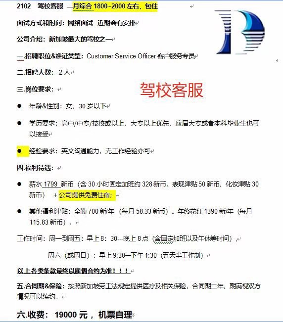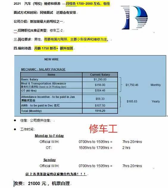 新加坡BBDC驾校修车工、驾校客服招聘