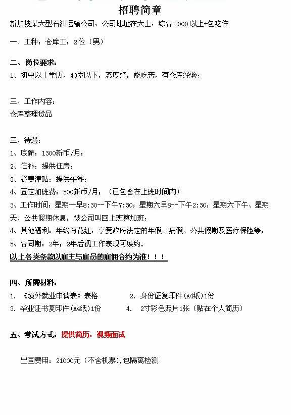 新加坡大型石油运输公司招聘仓库员