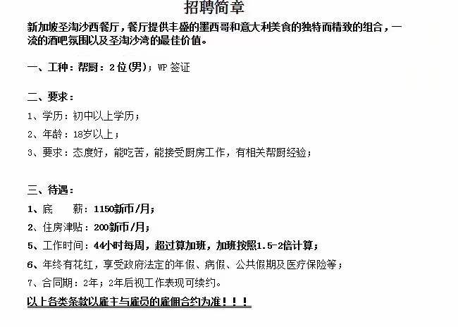 新加坡《圣淘沙》西餐厅帮厨招聘