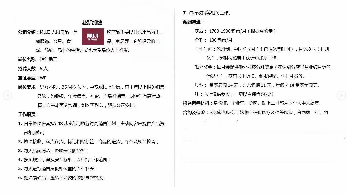 新加坡无印良品招聘销售助理招聘