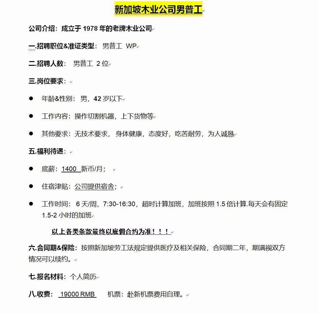 新加坡木业公司男普工(底薪1400新币提供住宿,加班另算)