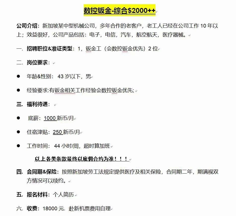 新加坡数控钣金工,综合收入2000新币以上