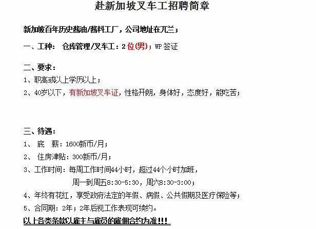 新加坡叉车工(底薪1600新币,加班另算)