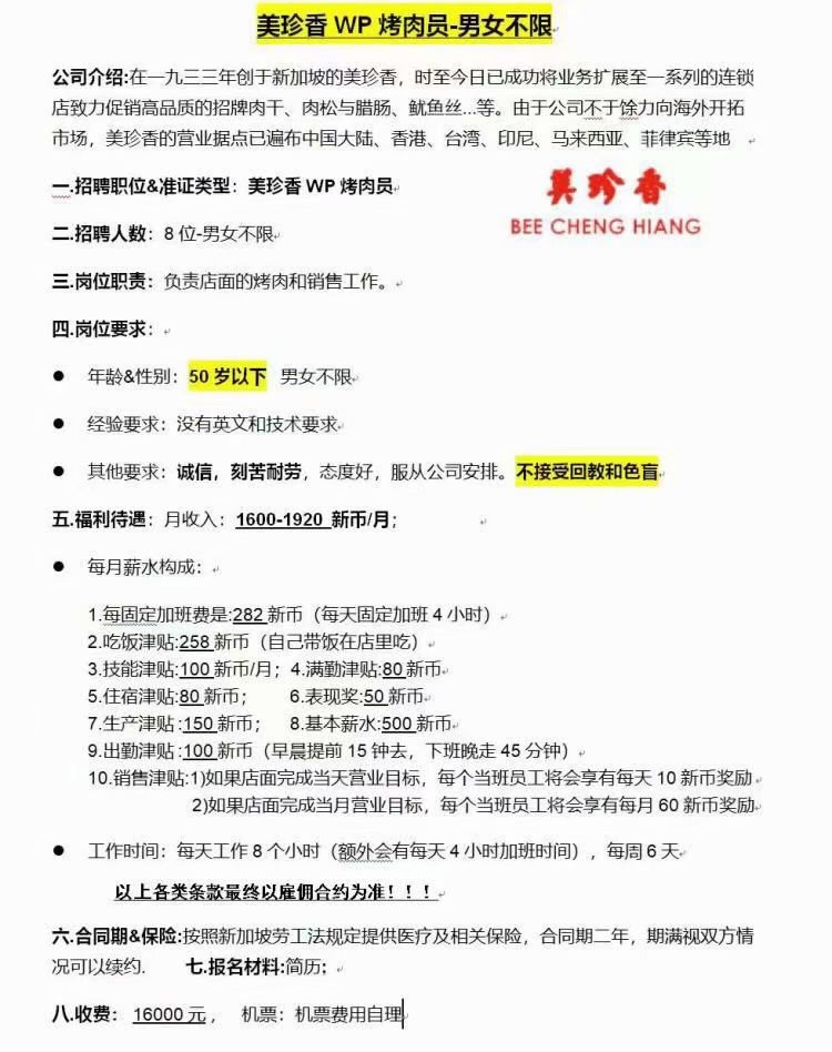 新加坡美珍香烤肉工(50岁以下,男女不限)