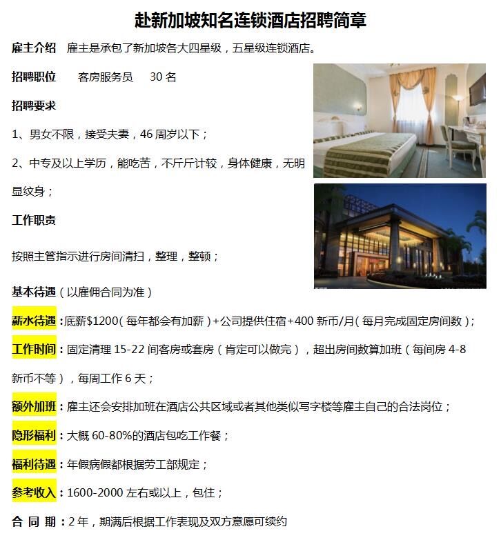新加坡四、五星级酒店客房服务员招聘(46岁以下男女不限)