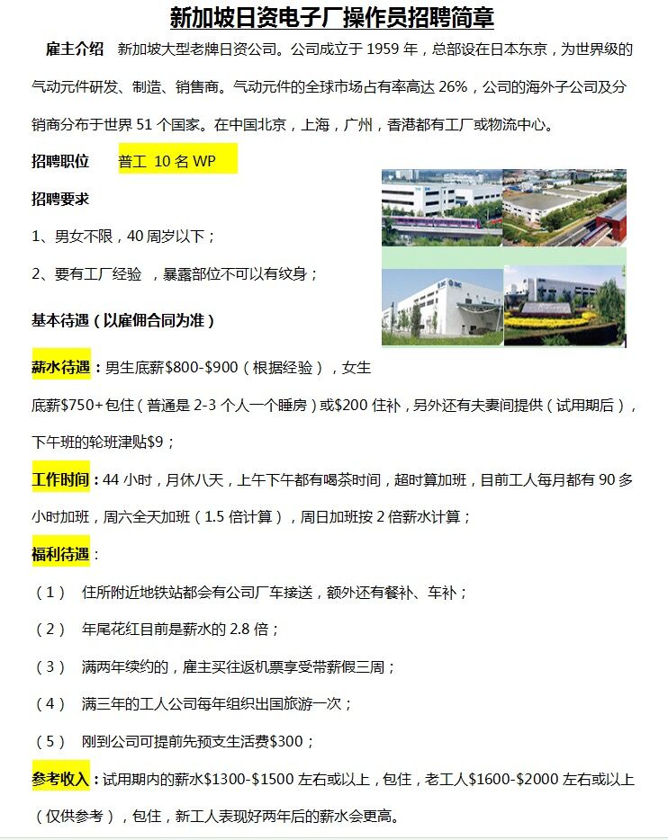 新加坡《SMC》日资电子厂操作工招聘
