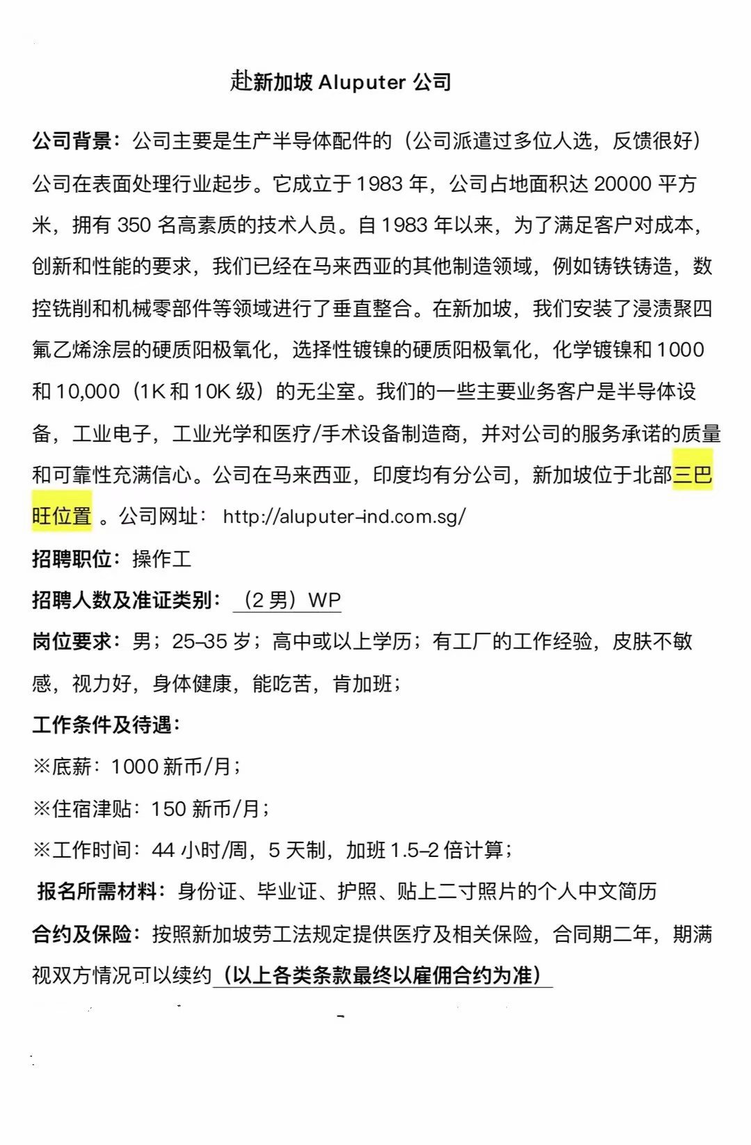 新加坡Aluputer半导体配件操作工(月收入2000-2500新币)