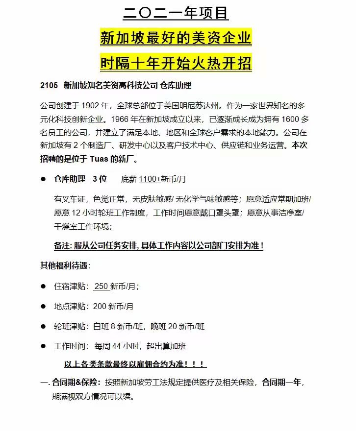 新加坡3M公司仓库助理(要有新加坡叉车证)