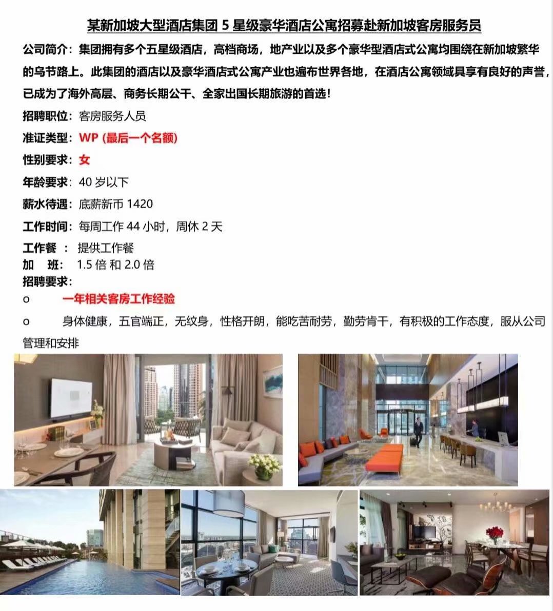 新加坡《五星级酒店》女客房服务员招聘
