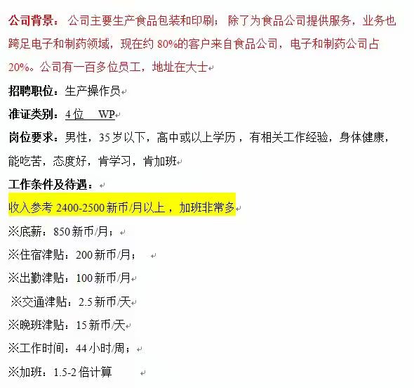 新加坡日晖包装工业公司男普工(月收入2400-2500新币以上)