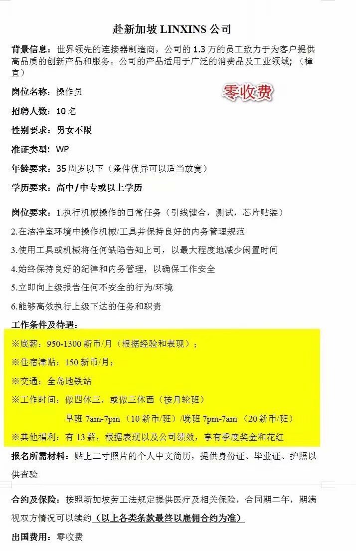 新加坡linxins男女操作工免费安排