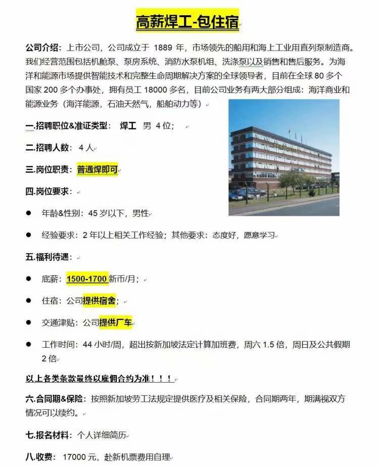新加坡上市公司普通电焊工招聘——高薪包住宿
