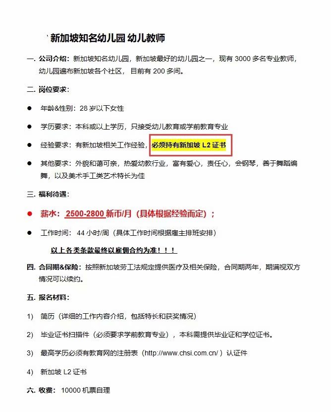 新加坡幼儿教师招聘——月收入12500元以上