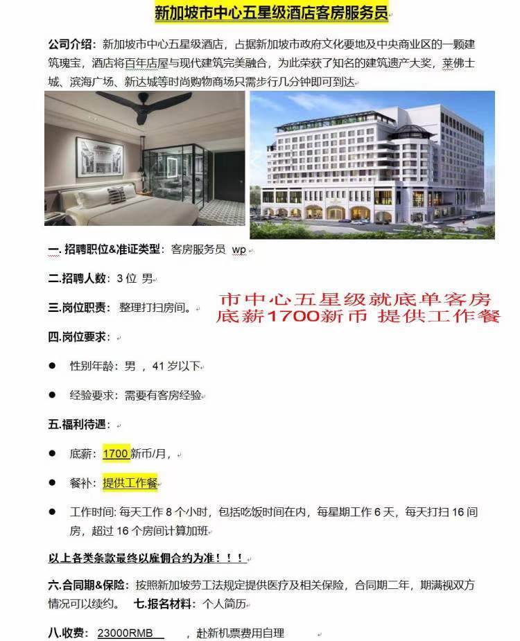 新加坡五星级酒店男客房服务员招聘——底薪就1700新币