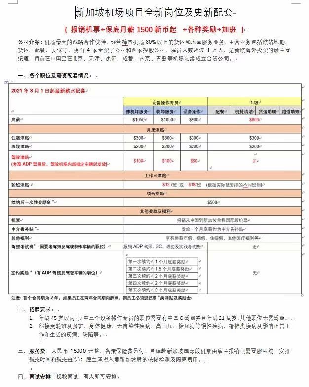 新加坡机场地勤项目招聘
