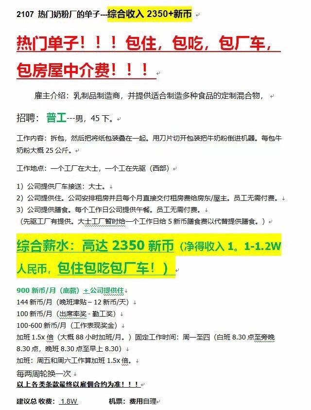 新加坡奶粉厂男普工招聘(包吃住的高薪好项目)