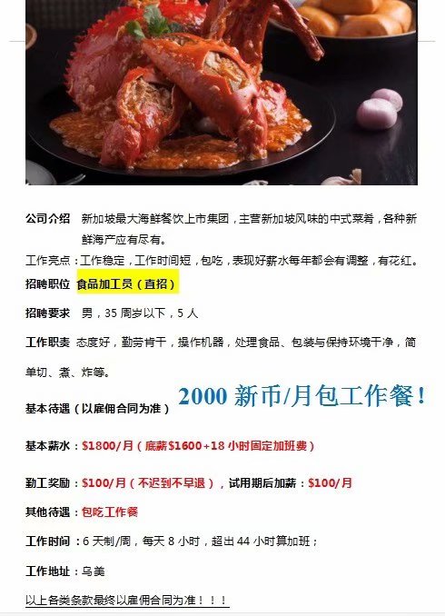 新加坡珍宝集团男食品加工员招聘
