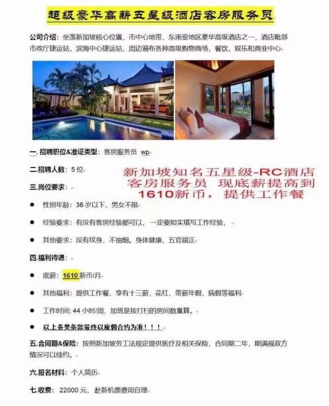 新加坡豪华五星级《RC》酒店客房服务员招聘——高底薪,加班多