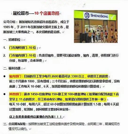 新加坡《昇松》超市男普工招聘——高收入的好项目