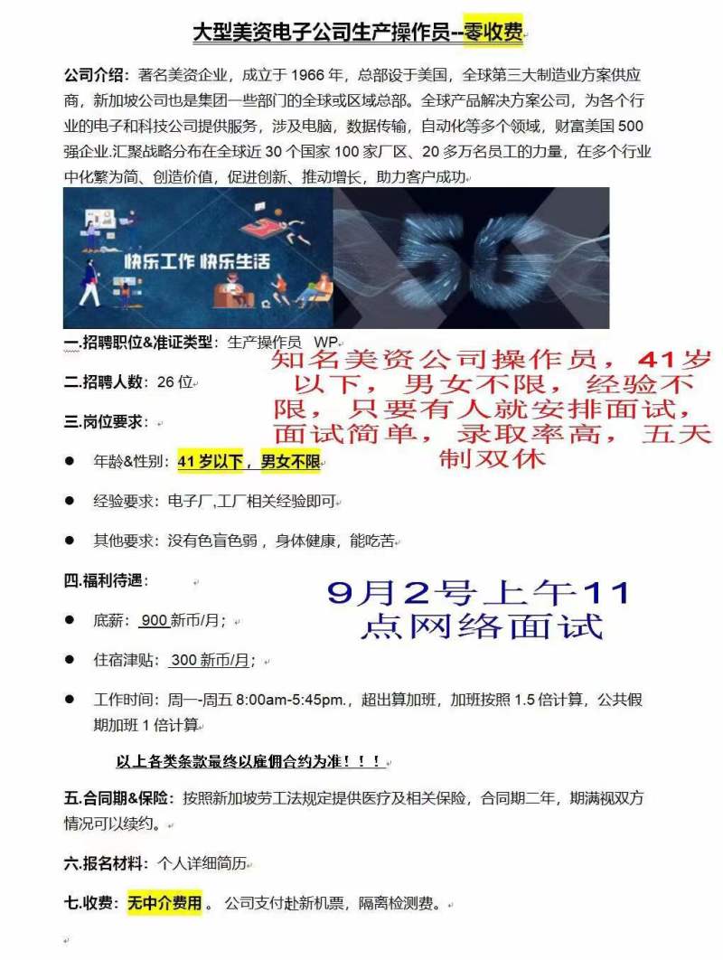 新加坡美资公司《捷普》操作工——9月2号面试