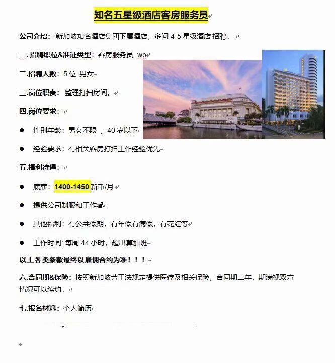 新加坡知名五星级酒店旗下酒店男女客房服务员招聘