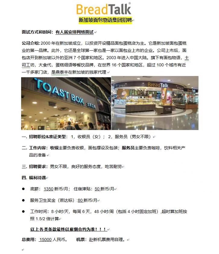 新加坡面包物语收银员&服务员招聘——视频面试,费用超低