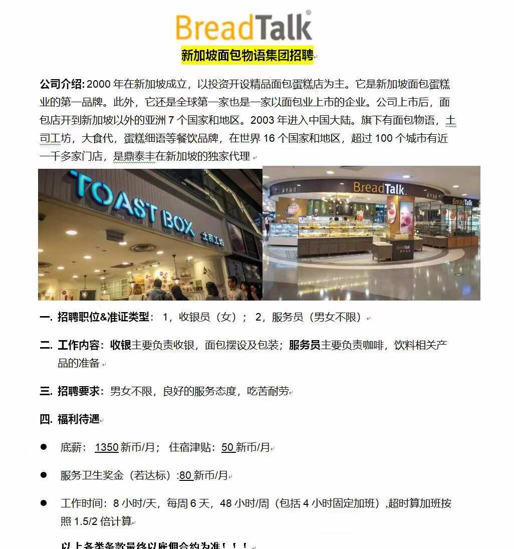 新加坡面包物语服务员、收银员招聘