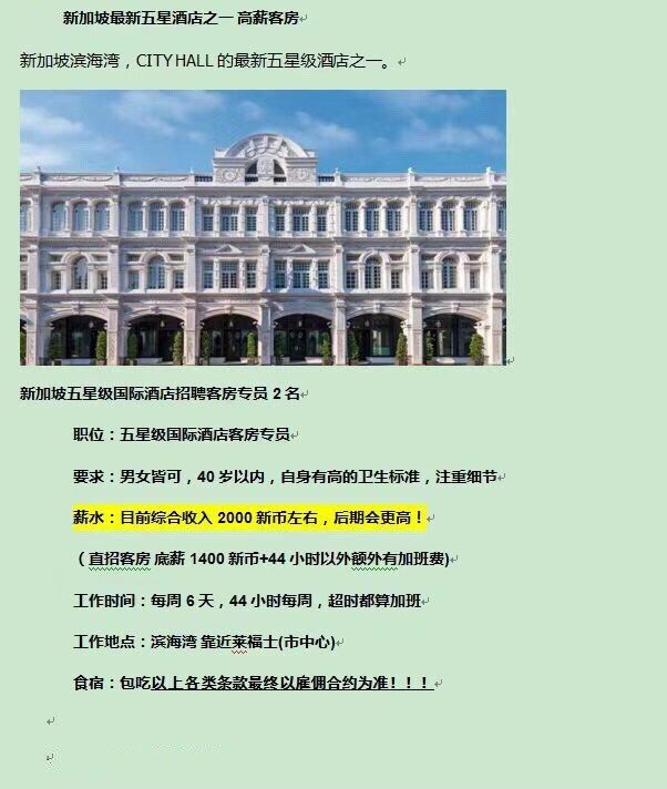 新加坡五星级《凯宾斯基酒店》客房服务员招聘