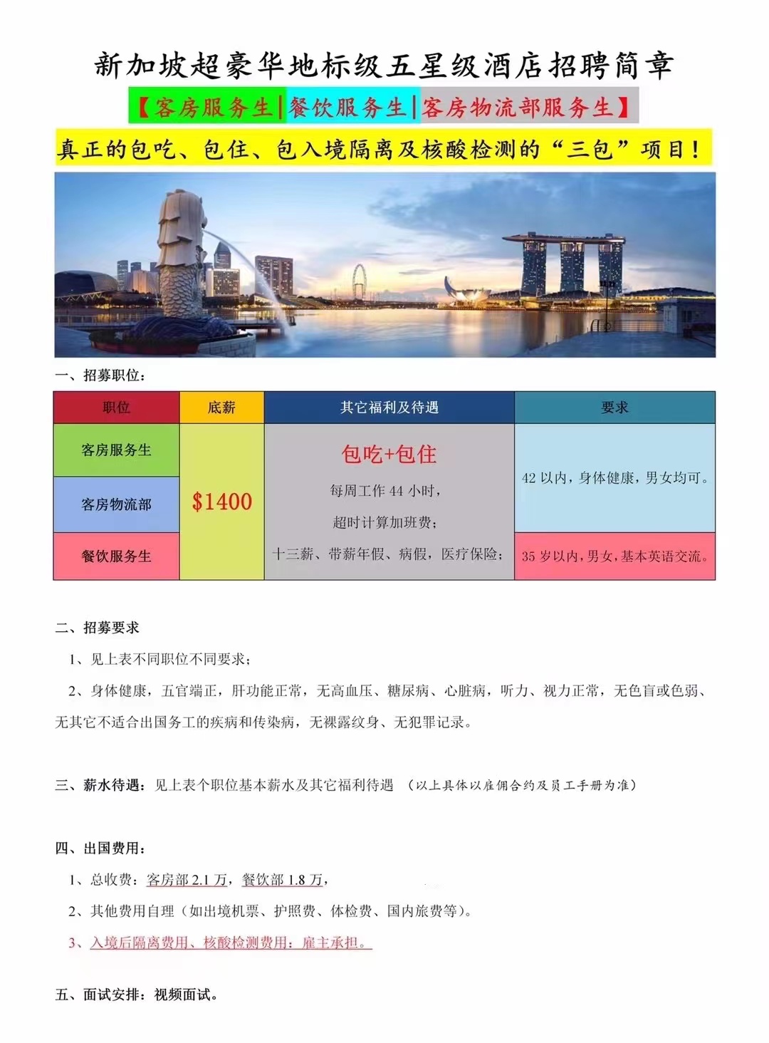 新加坡《金沙集团》客房服务员、物流部、餐饮服务员招聘